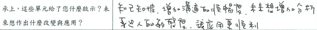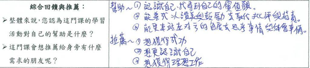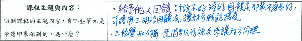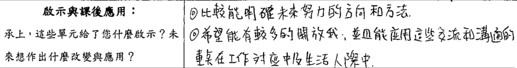 💡 「比較能明確未來努力的方向和方法。希望能有較多的開放我,並且能應用這些交流和溝通的重點在工作對應及生活人際中。」