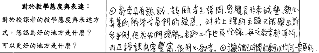 💡 「教學具有熱誠,鼓勵學生發問…對於上課的主題又能舉出許多事例,便於我們理解…授課內容豐富,很用心教學。」