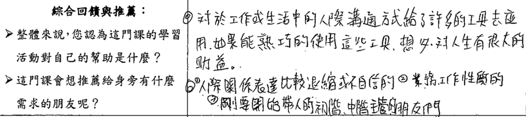 💡 「…老師的專業及認真是能讓我感受到的,同學們的提問,都能給予回饋及反思。期許還能開課,學習更多。」