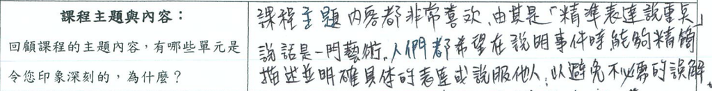 💡 「課程主題都非常喜歡,尤其是精準表達說重點。人們都希望能精簡描述並明確具體的表達或說服他人,以避免不必要的誤解。」